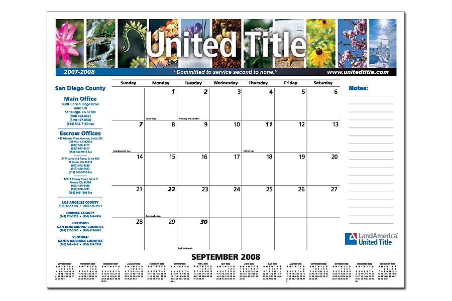 Each promotional calendar comes mounted on a heavy duty cardboard back board with heavy duty plastic corners to hold the monthly pages in place. The sample below shows how you can use color to make you desktop calendar stand out.